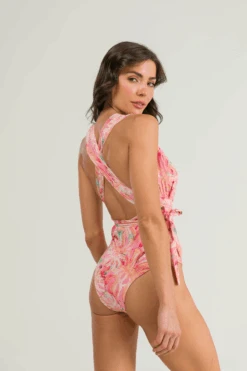 Sexy and classy all in one amazing one piece swimsuit. This luxurious swimsuit is made of a ultra luxurious fabric.  The front features a halter top design with black & white stripe print with a red mid drift stripe. The top ties behind the neck for an optimum fit. The back features a moderate cut rear. You will look sassy and classy in this fantastic one piece!!